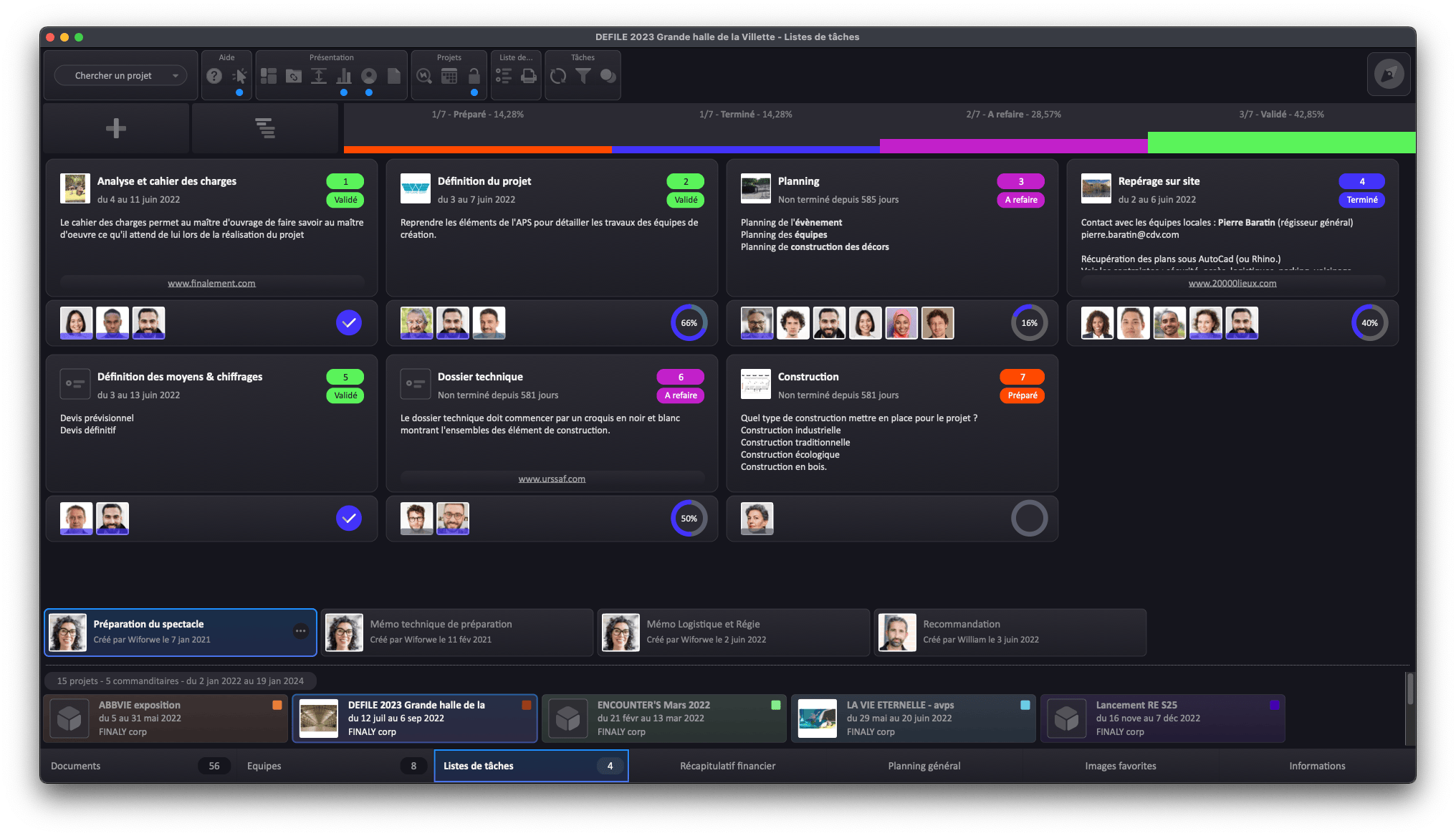 planning général • plannings de production • révervations personnels et équipements • tâches de travail